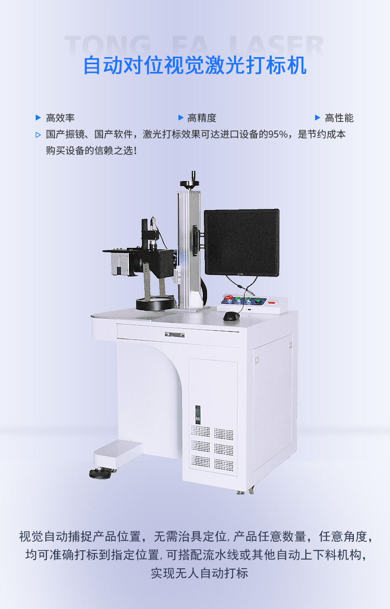 通發(fā)激光研發(fā)的自動對位視覺激光打標機TFL-F20CY-ZD,視覺自動捕捉產品位置,無需治具定位,產品任意數量,任意角度,均可準確打標到指定位置,可搭配流水線或其他自動上下料機構,節(jié)省人力,實現無人自動打標,可搭配流水線或其他自動上下料機構,節(jié)省人力,實現無人自動打標,極高的重復頻率,打標速度快;極高的光學質量,實現精細打標,可與光纖、CO2、半導體等各種波長的激光光路集成.