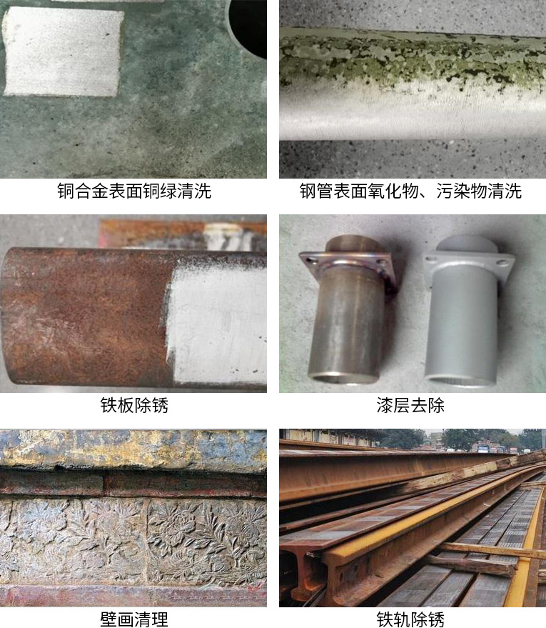 激光清洗具有無研磨、非接觸特點,不但可以用來清洗有機的污染物,也可以用來清洗無機物,包括金屬的銹蝕、金屬微粒、灰塵等,應用功效包括:除銹、脫漆、去油污、文物修復、除膠、去涂層、去鍍層。適用于銹層、漆層較厚,油污較深的情況下清潔,以及表面粗糙化、焊縫清潔等工藝環節,效率極高。應用行業:航空、船舶、文物保護、汽車周邊、食品行業、軌道、橡膠模具、其他。