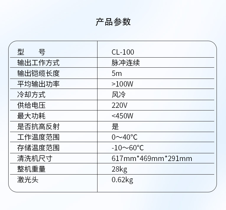 該清洗機依托MOPA 結構的優勢,配備 100W 清洗式脈沖光纖激光器作為清洗光源,激光器采用主振蕩器功率放大 MOPA(Master Oscillator Power Amplifier)結構,其中主振蕩利用半導體激光器作為種子源,功率放大則通過行波光纖放大器來實現。本款 MOPA 光纖激光器具有脈沖寬度和頻率獨立可調的特點,在對脈寬和頻率進行改動的情況下仍可保持較高的穩定峰值功率輸出,以適應更廣泛的清洗場景。